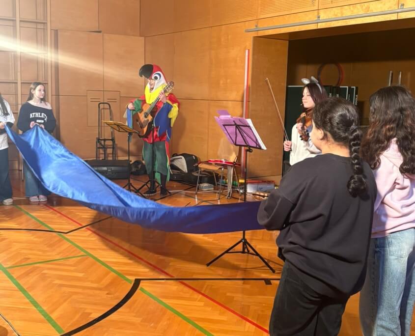 Am 22.1. besuchte uns Herr Wittenberger mit einer Kollegin und führte allen ersten Klassen ein tolles Mitmachkonzert zum Thema ,,Karneval der Tiere“ vor.